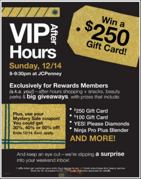 JC Penney will be hosting a VIP After Hours Event this Sunday, 12/14, from 8-9:30p. There will be giveaways, snacks/refreshments, will even have local Country Hop and Roll artist Louie Lee performing an acoustic set! This event is for Rewards Members only!
